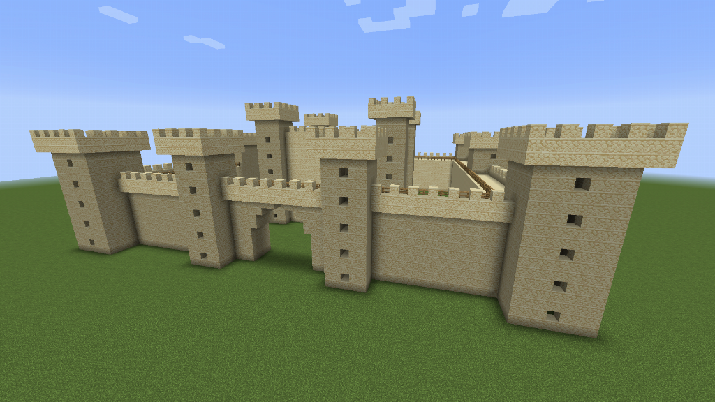 The most important component of a English castle is the outer castle wall, so I made the one below quite elaborate. The wall has an archway entrance, an inner and outer skin, an overhang, crenellations and a wall-top fence. Feel free to add arrow slit windows and perhaps inner platforms, ladders and doors!